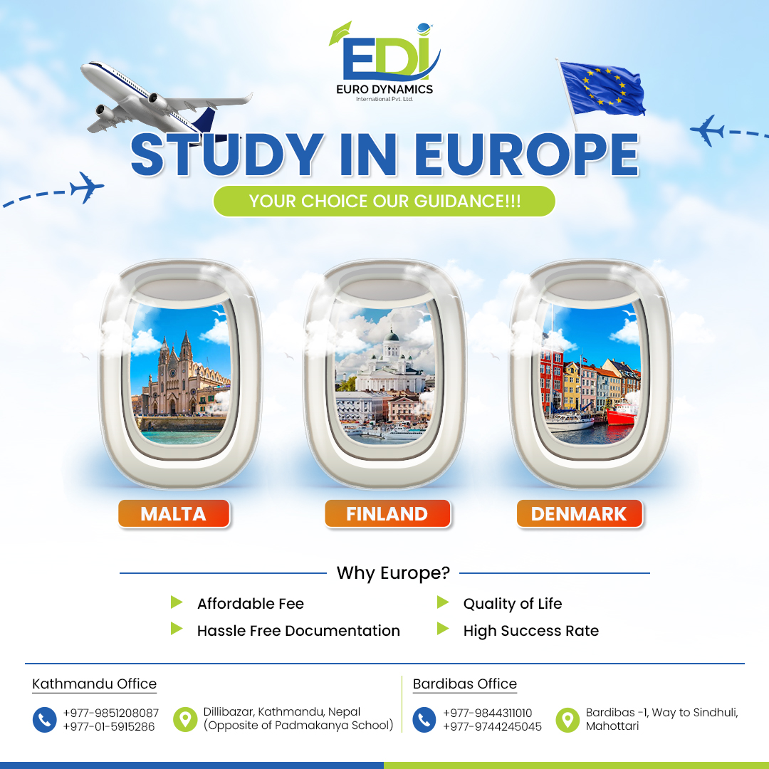 Euro Dynamics International PVT LTD. is a dynamic and innovative collection of businesses. We are a team of certified education consultants dedicated to providing professional, competent, and dependable services to clients who aspire to study or relocate overseas. As a certified education consultancy, Euro Dynamics International PVT LTD. represents esteemed institutions across Europe, including Denmark, Finland, Malta, Greece, and many more. Our mission has always been to deliver honest, up-to-date, and accurate information coupled with courteous, personalized service.
